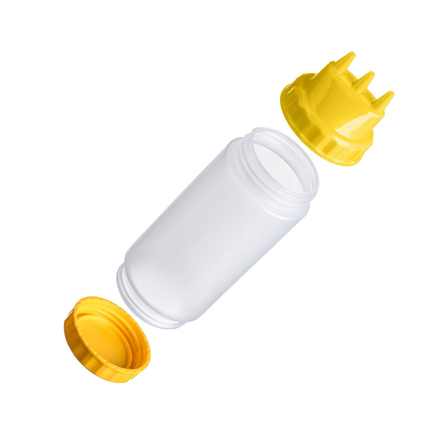 Емкость для соуса 500 мл. d=70 мм. h=200 мм. с 2 крышками 3 носика, широкая прозрачная, крышки желтые GP /1/96/