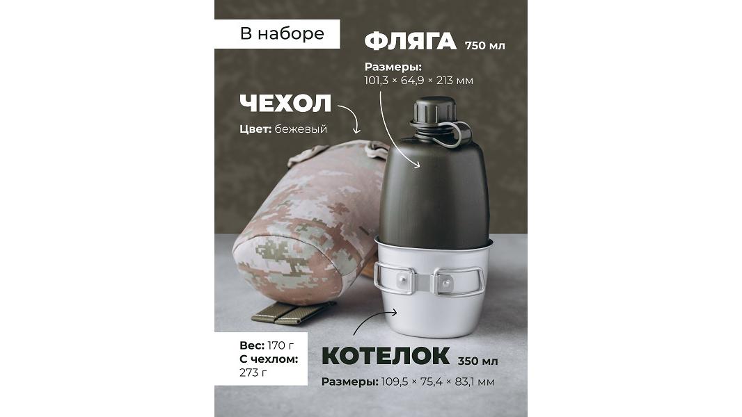 string(378) "101,3*64,9*213 (фляга 750мл) 109,5*75,4*83,1 (котелок 350мл), вес 170гр, с чехлом 273гр. Фляга предназначена для содержания питьевой воды, котелок для приготовления кипятка. Материал: фляга полиэтилен, котелок: пищевой алюминий.