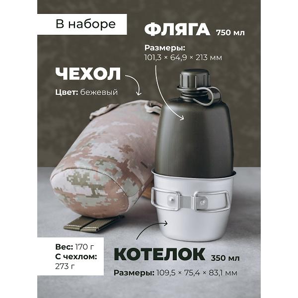 101,3*64,9*213 (фляга 750мл) 109,5*75,4*83,1 (котелок 350мл), вес 170гр, с чехлом 273гр. Фляга предназначена для содержания питьевой воды, котелок для приготовления кипятка. Материал: фляга полиэтилен, котелок: пищевой алюминий.