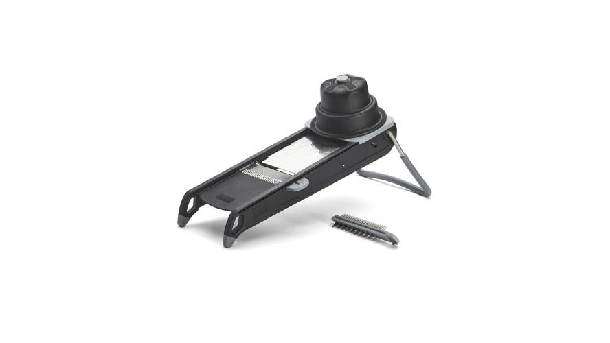 Сменные лезвия «Жюльен» расположены под овощерезкой, две складные ножки.