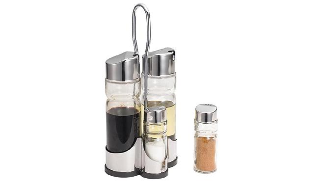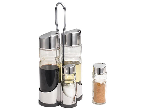 Набор предметов для специй, в который входит солонка, перечница, емкости для масла и уксуса.