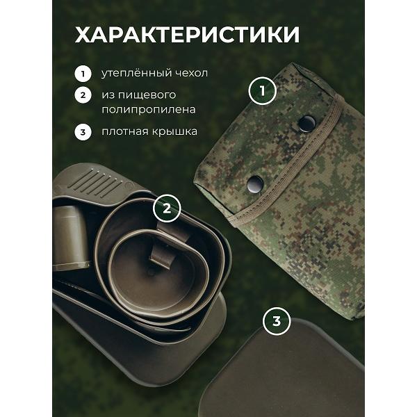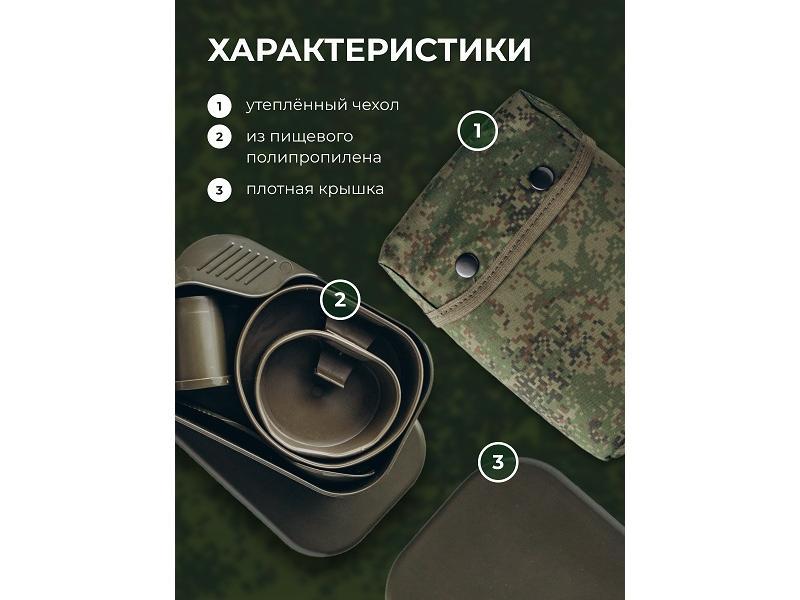 Вес с чехлом 490гр. Пластиковый комплект состоит из: Контейнер (предназначен для хранения в походном положении тарелки, чашки, прибора для специй и столового прибора. Крышка контейнера служит подносом для тарелки и чашки, корпус контейнера предназначен для второго блюда). Тарелка складная 700мл, чашка складная 300мл, прибор для специй трехсекционный, столовый прибор 3 в 1. Материал: контейнер, прибор для специй - полипролилен. Чашка, Тарелка - термоэластопласт, Столовый прибор - АБС пластик.