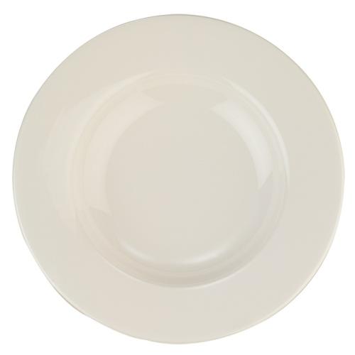 Тарелка белого цвета со сливочным оттенком.
