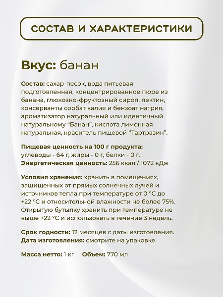 Состав: сахар-песок, вода питьевая подготовленная, глюкозо-фруктозный сироп, концентрированное пюре из банана,